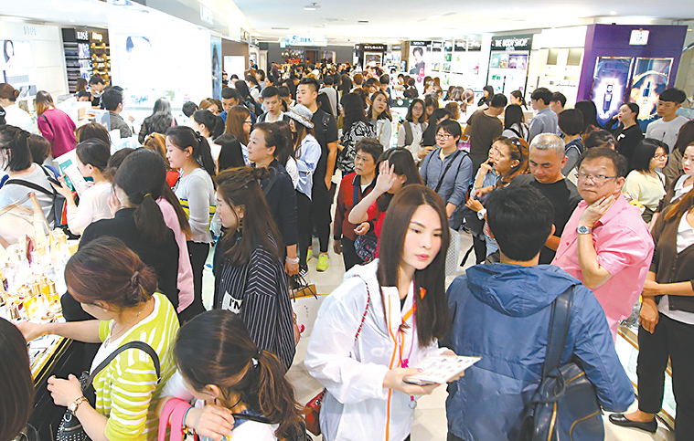圖片說明:1日,韓國首爾一大型免稅店內(nèi)擠滿了中國游客。