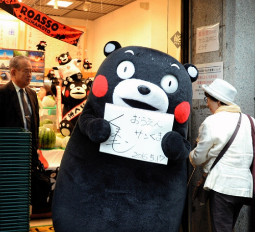中新網(wǎng)5月18日電 據(jù)日媒報(bào)道,日本熊本縣的吉祥物“熊本熊(酷MA萌)”本月17日現(xiàn)身東京都中央?yún)^(qū)的該縣特產(chǎn)直銷店“銀座熊本館”,向支援熊本地震災(zāi)區(qū)的來店顧客表達(dá)謝意。