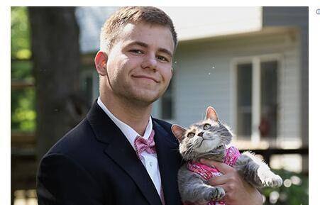 山姆給自己的貓穿了漂亮的粉色裙子和運動鞋,而他自己則身穿西服,戴著和貓的衣服顏色相稱的領(lǐng)結(jié)。據(jù)報道,山姆不打算把貓帶到舞會上,因為擔心貓會感到不舒服,但這并不影響他拍照留念。