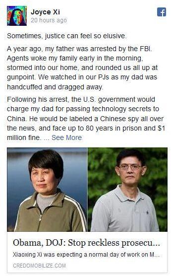 郗雨姍在臉書上寫道:自己的父親郗小星不是唯一一個被美國政府錯誤指控的華裔科學(xué)家。 其他華裔科學(xué)家如陳霞芬(SherryChen)、曹國慶(Cao Guoqing)和李書玉(ShuyuLi)也經(jīng)歷了相同的事,他們被控間諜罪,后來又被毫無原因地撤銷指控,但是造成的后果對所有人的家庭都是毀滅性的,而政府卻完全不用為此負(fù)責(zé)。