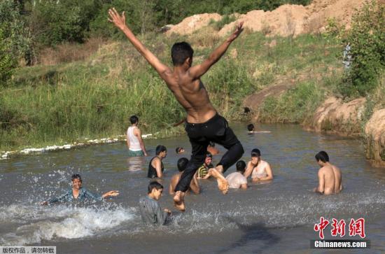 巴基斯坦首都伊斯蘭堡,一名男孩跳入河水中嬉水降溫。