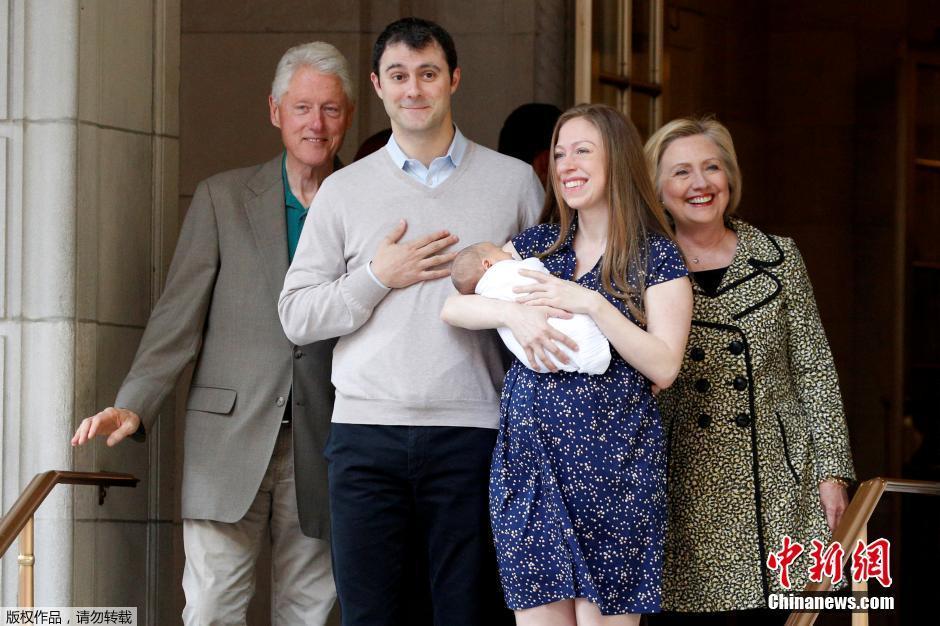 當?shù)貢r間2016年6月20日消息,美國紐約,美國前總統(tǒng)克林頓與現(xiàn)任民主黨總統(tǒng)參選人希拉里夫妻倆18日喜迎第2個外孫,獨生女切爾西在推特宣布兒子誕生喜悅,并將孩子命名為“艾丹·克林頓·梅茲文斯基(Aidan Clinton Mezvinsky)”。圖為6月20日切爾西抱愛子走出醫(yī)院。