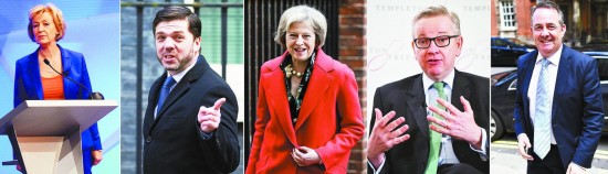 上圖:英國保守黨6月30日宣布,該黨5名下院議員將競選下一任黨魁,勝選者預計于今年10月接替卡梅倫出任保守黨新黨魁和新首相。從左至右分別為:負責能源事務的國務大臣安德烈婭·利德索姆、就業(yè)和養(yǎng)老金事務大臣斯蒂芬·克拉博、內(nèi)政大臣特雷莎·梅、司法大臣邁克爾·戈夫和前國防大臣利亞姆·?怂。