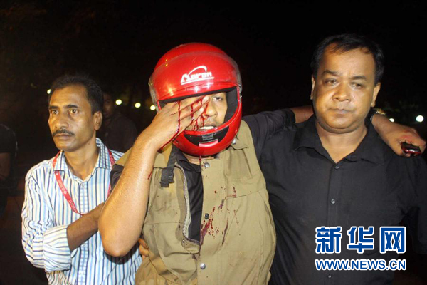 7月2日凌晨,在孟加拉國首都達卡,人們轉移襲擊事件中的受傷警察。新華社發(fā)