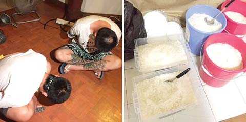 圖為菲緝毒署人員在拉斯賓迎斯市菲美人壽村一個疑似毒品工場內逮捕的2名臺灣人和毒品。
