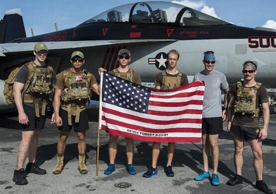7月4日,美軍士兵等在航行于南海的“羅納德·里根”號(hào)航母甲板上舉著星條旗紀(jì)念美國(guó)獨(dú)立日。