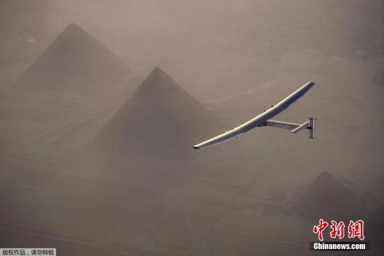 當(dāng)?shù)貢r(shí)間7月13日,瑞士飛行員駕駛的全球最大太陽(yáng)能飛機(jī)“陽(yáng)光動(dòng)力2號(hào)”從埃及吉薩金字塔上空飛過(guò),之后飛機(jī)在開(kāi)羅國(guó)際機(jī)場(chǎng)降落。