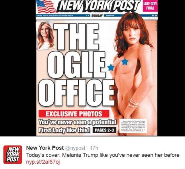 美國共和黨總統(tǒng)候選人特朗普的妻子梅拉尼婭(Melania Trump),有可能會(huì)成為美國第一夫人,但《紐約郵報(bào)》(New York Post)8月1日又在頭版刊登她年輕時(shí)當(dāng)模特兒期間拍攝的裸照,此舉惹來社交媒體網(wǎng)民批評(píng),被指羞辱女性。