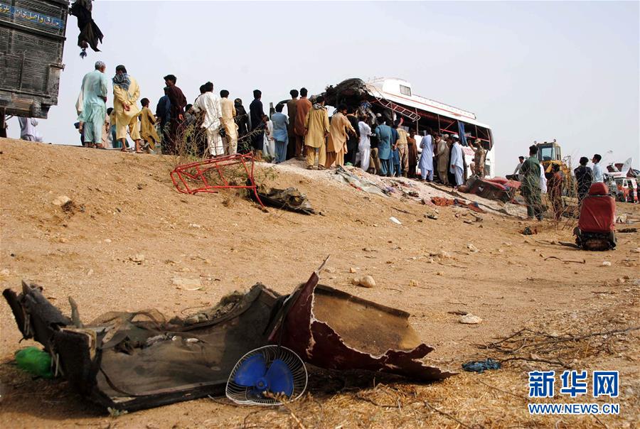 8月2日,在巴基斯坦南部信德省賈姆舒魯?shù)貐^(qū)的一條公路上,巴基斯坦人聚集在車(chē)禍現(xiàn)場(chǎng)。巴基斯坦南部信德省2日上午發(fā)生一起客車(chē)與拖車(chē)相撞事故,造成至少12人死亡、30人受傷。 新華社發(fā)