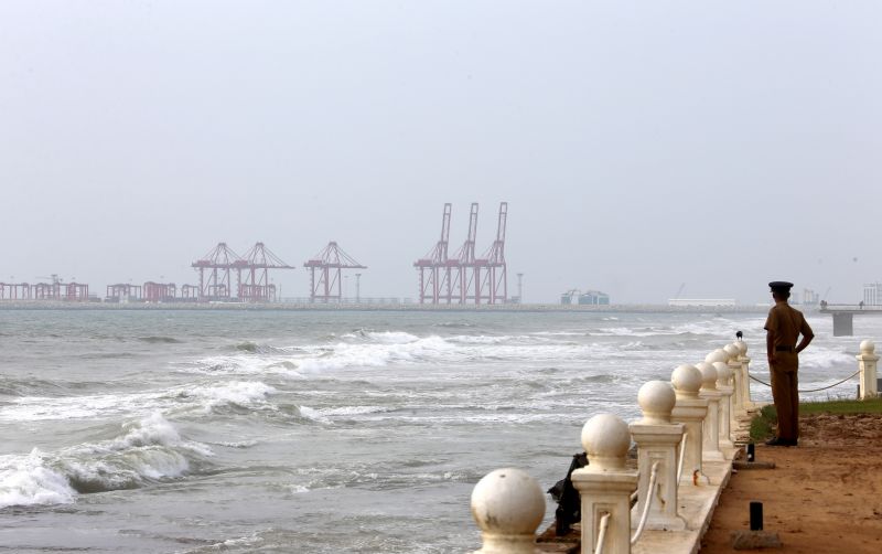 一位安保人員在斯里蘭卡科倫坡海濱執(zhí)勤,遠處是中國參與投資興建的港口。