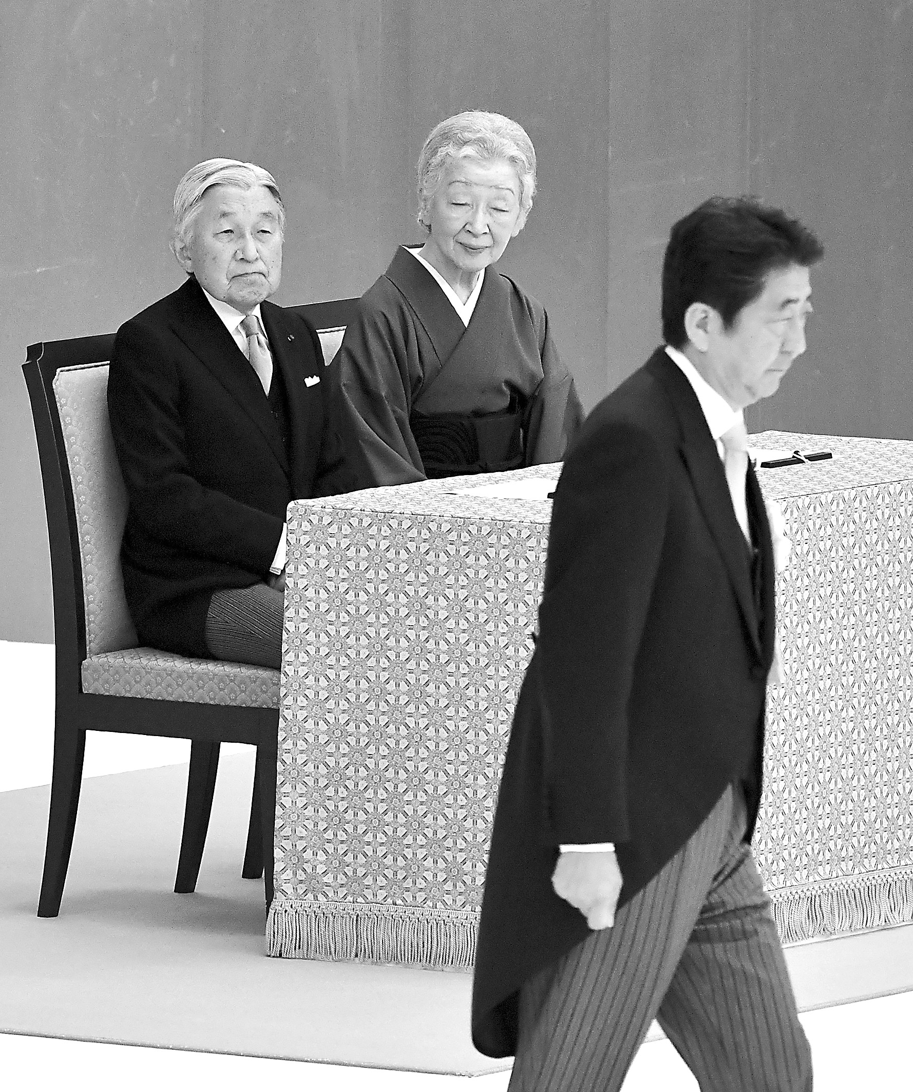 15日,日本天皇夫婦與首相安倍晉三在日本“全國(guó)戰(zhàn)歿者追悼?jī)x式”上。