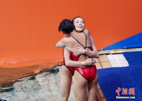 當地時間8月7日,在里約奧運會女子雙人三米板決賽中,中國選手吳敏霞和施廷懋一路領先,無懸念奪得桂冠。圖為施廷懋擁抱吳敏霞。中新網記者 杜洋 攝