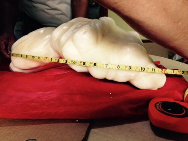 珍珠寬30厘米、長66厘米左右,此前世界上重6.5公斤、價(jià)值3500萬美元的最大珍珠在其面前相形見絀。(圖中為2.2英尺)