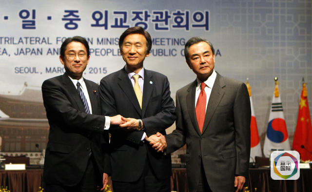 2015年3月21日,中國外交部長王毅(右)與韓國外交部長尹炳世(中)、日本外相岸田文雄在第七次中日韓外長會(huì)前合影。 (新華社記者姚琪琳攝)