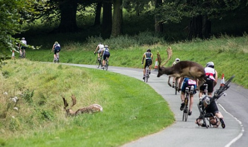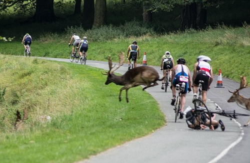 報(bào)道稱,都柏林一個(gè)小鎮(zhèn)日前舉辦鐵人三項(xiàng)比賽,其中自行車10公里競(jìng)賽在行經(jīng)當(dāng)?shù)匾粋(gè)公園時(shí),草叢中突然竄出兩只鹿,第一只鹿先是靈敏的避開,跳過所有騎手,不過第二只可就沒這么幸運(yùn)了,它竟然不偏不倚的撞倒了行進(jìn)中的選手尚恩(Shane O'Reilly),讓尚恩當(dāng)場(chǎng)翻摔倒。