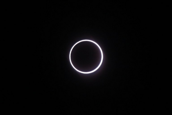 在日食達(dá)到高峰時(shí),地球、月球和太陽的位置幾乎成一直線,明亮的太陽被黑色月球陰影遮住,只露出周圍一圈亮光。