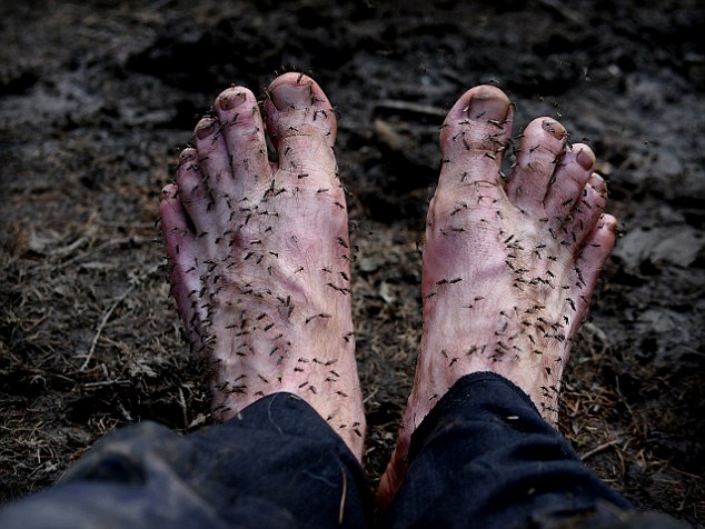 近日,查普在拍攝報(bào)道西伯利亞和北極地區(qū)猛犸象象牙的非法狩獵現(xiàn)象,而在穿過(guò)俄羅斯荒野時(shí),蚊蟲是他面臨的一大難題。他在趟過(guò)當(dāng)?shù)氐囊粭l河流后,不得不脫下襪子曬干,而在1分鐘內(nèi)一大群蚊蟲向他襲來(lái),飛快爬上腳面叮咬,痛苦無(wú)比,他便拍攝了這張照片。