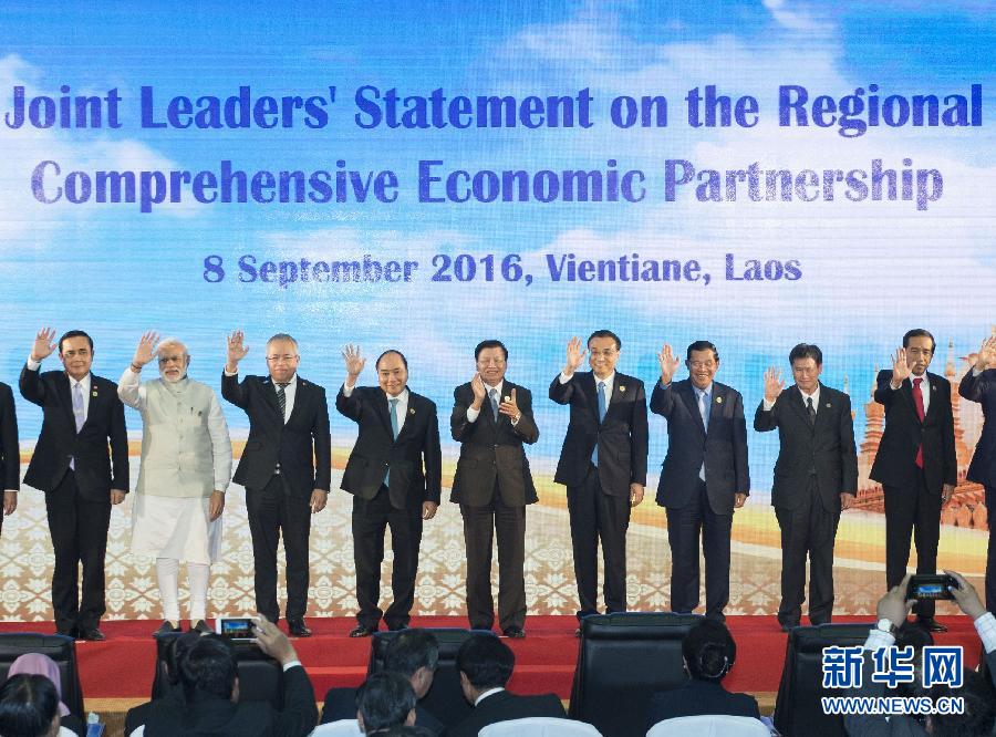 9月8日,中國國務(wù)院總理李克強在萬象國家會議中心出席第十一屆東亞峰會。峰會后,李克強與東盟十國及韓國、日本、印度、澳大利亞、新西蘭等國領(lǐng)導(dǎo)人共同出席《區(qū)域全面經(jīng)濟伙伴關(guān)系協(xié)定》聯(lián)合聲明發(fā)布儀式。這是發(fā)布儀式上,李克強同與會領(lǐng)導(dǎo)人集體合影。新華社記者王曄攝