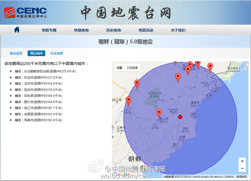 中國地震臺網(wǎng)公布了震中周邊中國縣城的分布情況,其中,距震中最近的地區(qū)為長白山縣,僅有76公里。