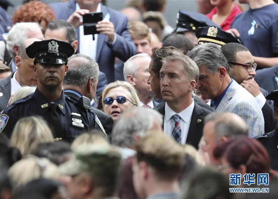資料圖:9月11日,在美國紐約,民主黨總統(tǒng)候選人希拉里·克林頓(中,戴墨鏡者)抵達活動現(xiàn)場。當天,“9·11”恐怖襲擊事件15周年紀念活動在美國紐約“9·11”紀念廣場舉行。 新華社記者王迎攝