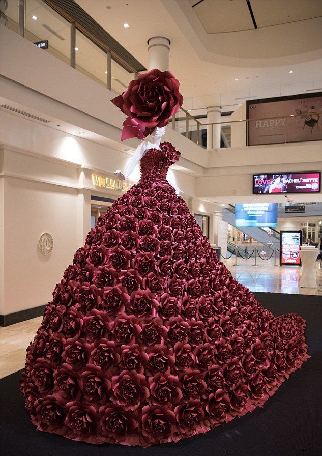 這款長裙名為“紅玫瑰”,高3.5米,長4米,由400余朵紙質(zhì)玫瑰精心制成,色彩明艷,奪人眼球。據(jù)了解,長裙上的每朵玫瑰均為純手工制作,花費(fèi)100多個小時制成。而后,這些玫瑰從倫敦被運(yùn)往悉尼,由布蘭德利耗時一周打造而成。布蘭德利以設(shè)計此類紙質(zhì)禮服聞名,其設(shè)計作品曾在哈羅茲、蒂凡尼、路易威登等名店展出,也曾在《時尚芭莎》等知名時尚雜志上出現(xiàn)。