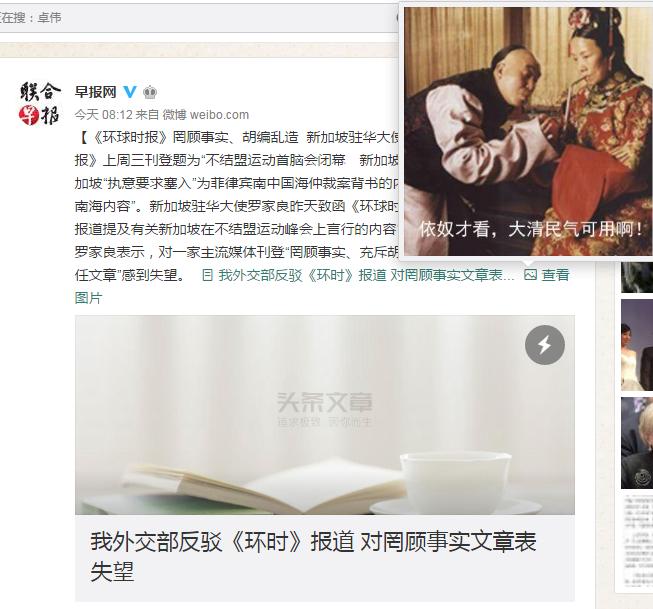 看看東盟大多數(shù)國家是怎樣平衡處理南海仲裁這一敏感問題的,我認為新加坡應當為你們在這個時候給自己的第一大貿易伙伴中國使絆而感到羞愧。我認為大使先生應敦促您的國家反思,而不是給報道真實情況的《環(huán)球時報》扣帽子。