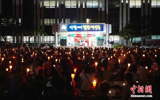7月31日,美韓當(dāng)局公布的“薩德”反導(dǎo)系統(tǒng)部署地——韓國慶尚北道星州郡當(dāng)?shù)氐氖就顒右呀?jīng)進入第20天。每天都有上千名頭戴“反對‘薩德’”字樣頭巾、高舉“不要‘薩德’要和平”、“美軍離開韓國”等標(biāo)語的抗議者在郡政府前點燃燭火示威,祈愿和平。 中新社記者吳旭攝