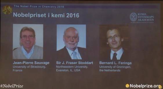諾貝爾獎(jiǎng)官方消息,Jean-Pierre Sauvage, Sir J. Fraser Stoddart 和Bernard L. Feringa獲得了今年的諾貝爾化學(xué)獎(jiǎng)學(xué)獎(jiǎng),他們分別來自法國(guó)、美國(guó)、荷蘭。獲獎(jiǎng)原因?yàn)椤胺肿訖C(jī)器的設(shè)計(jì)和合成”。