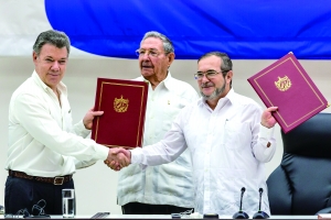今年6月23日,在古巴領(lǐng)導(dǎo)人勞爾·卡斯特羅(中)的見證下,哥倫比亞總統(tǒng)桑托斯(左)和“哥武”指揮官蒂莫萊翁·希門尼斯在哈瓦那交換最終和平協(xié)議。新華社發(fā)