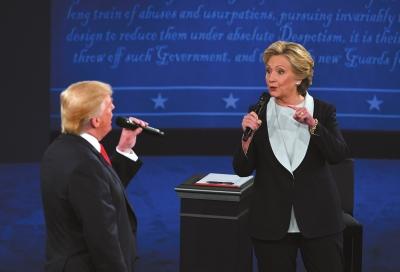 特朗普(左)和希拉里·克林頓在美國(guó)總統(tǒng)候選人第二場(chǎng)電視辯論中。新華社發(fā)