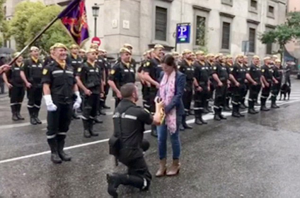 當?shù)貢r間2016年10月12日,是西班牙的法定國慶日。這一天,一段令人感動的視頻記錄了一次甜蜜且成功的求婚儀式。