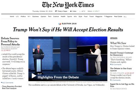 《紐約時報》頭條:特朗普拒絕對是否接受選舉結果表態(tài)。