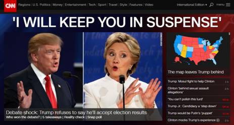 本場辯論依然延續(xù)了特朗普和希拉里彼此互相攻擊、相愛相殺的風格。甚至還出現驚心動魄的一幕:特朗普宣稱如果11月8日宣告自己與總統(tǒng)寶座失之交臂,他就很有可能會拒絕美總統(tǒng)大選的結果,因為他實在是看到了太多的黑料了。