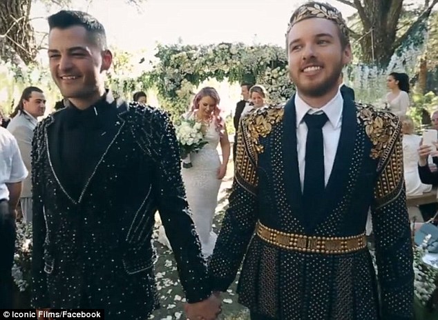 10月15日,澳大利亞男子喬治 艾斯沙(George Elsissa)和米切爾 唐頓(Mitchell Taunton)在該國藍(lán)山舉行了奢華的婚禮儀式,結(jié)為連理;槎Y上,米切爾頭戴黃金葉狀頭冠,身著點綴黃金葉的同款羅馬風(fēng)格外套,格外引人注目。