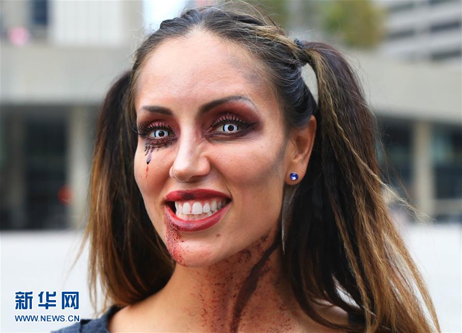 當(dāng)日,眾多狂歡者扮作“僵尸”來到多倫多市政廣場參加“僵尸”游行聚會活動,迎接將于10月31日到來的萬圣夜。 新華社發(fā)(鄒崢攝)