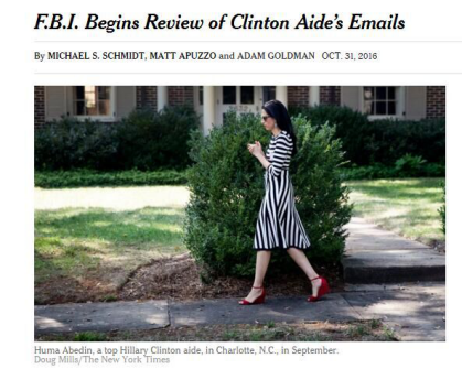 FBI開(kāi)始篩查希拉里助手電郵。圖為今年9月,希拉里助手胡瑪·阿伯丁在北卡羅萊納州夏洛特。紐約時(shí)報(bào)網(wǎng)站截圖