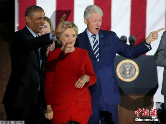 美國總統(tǒng)選舉將在當(dāng)?shù)貢r間11月8日迎來投票日,美國總統(tǒng)候選人希拉里與特朗普仍在舉行大選前最后一天的競選活動。圖為美國總統(tǒng)奧巴馬(左),美國前總統(tǒng)克林頓(右)共同為希拉里助陣。