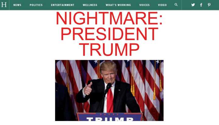 北京時間11月9日,特朗普贏得2016年美國總統(tǒng)選舉。雖然特朗普的參選在一年前曾被視作笑料,但本次選情地圖竟令人“大跌眼鏡”般多地飄“紅”,特朗普更是早于希拉里得到270張選舉人票。不出意外,在大選結(jié)果愈發(fā)明朗之際,已有希拉里支持者沮喪大哭,隨后,美國多地甚至爆發(fā)示威以抗議特朗普當選。在多數(shù)美媒還在報道選情結(jié)果時,美國《赫芬頓郵報》就在網(wǎng)站首頁首屏以《噩夢:特朗普總統(tǒng)》為題,來評論美國這一“難以想象”的選舉結(jié)果。