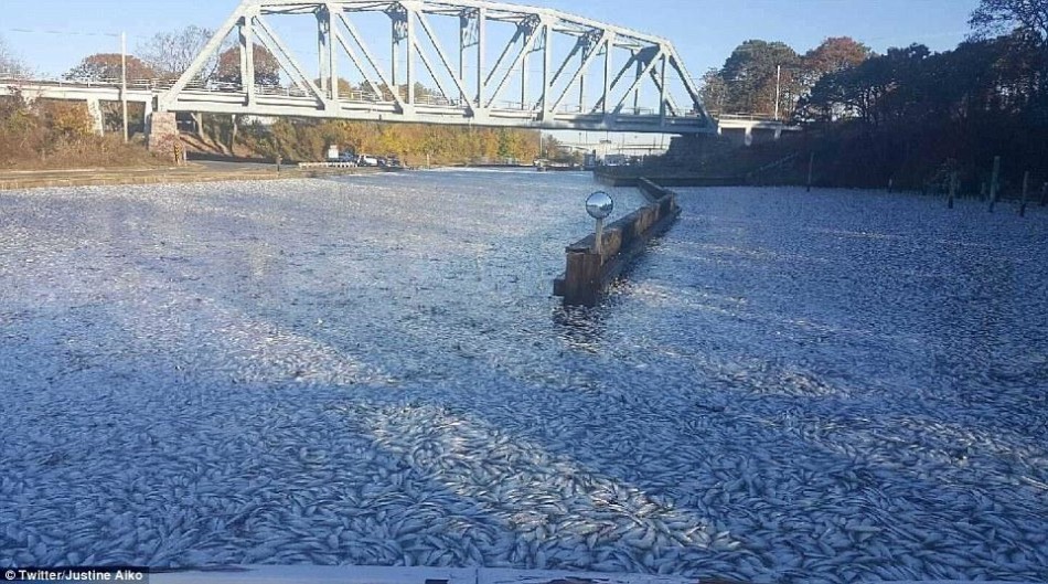 本周,美國(guó)紐約長(zhǎng)島的一條運(yùn)河上漂浮著上萬(wàn)條死魚(yú)。無(wú)數(shù)的鯡魚(yú)尸體密密麻麻地漂浮在水面,閃著銀光,遠(yuǎn)看就像是運(yùn)河被冰凍住了一樣?茖W(xué)家稱(chēng)這現(xiàn)象前所未有,有當(dāng)?shù)厝税堰@稱(chēng)為一次“魚(yú)類(lèi)天啟”(fishpocalypse)。