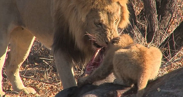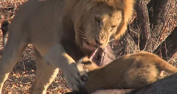 當(dāng)其它小獅子正安心地在尸體尾部享受美食時(shí),這只企圖與父親搶食的小獅子卻被一把揪住狠摔在地。就在它迅速爬起,再次靠近食物時(shí),父親伸手便按住這個(gè)放肆的小家伙的腦袋不讓它靠近。小獅子痛苦地低吼幾聲后不得不乖乖等在旁邊,等待輪到自己進(jìn)食。