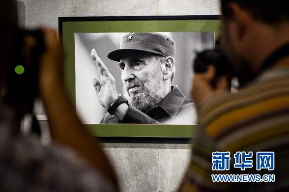 這是2014年8月12日,在菲德?tīng)枴たㄋ固亓_88歲生日前夕,觀眾在古巴哈瓦那一幅卡斯特羅的照片前拍照。 新華社記者劉彬攝