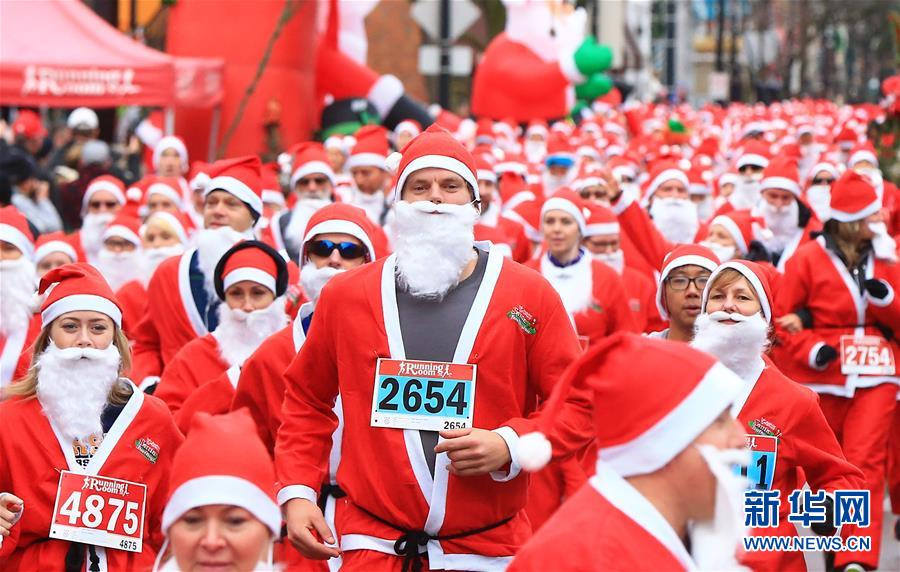 11月26日,在加拿大安大略省伯靈頓市,人們身穿圣誕老人服裝參加健身跑活動(dòng)。當(dāng)日,加拿大安大略省伯靈頓市舉辦一年一度的圣誕老人健身跑慈善活動(dòng),吸引了2000余名“圣誕老人”參與。新華社發(fā)(鄒崢攝)