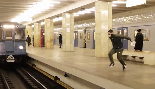 視頻中的這名男子看起來像是一名青少年,在整個拍攝過程中,他一直用圍巾遮住面部。在視頻開頭,該男子正坐在地鐵站的長椅上系鞋帶;疖囬_始進(jìn)站時(shí),他立即沖到站臺上,待車身離他只有數(shù)米遠(yuǎn)時(shí)縱身一躍,在空中翻了一個跟頭,然后又落在了另一側(cè)站臺上。