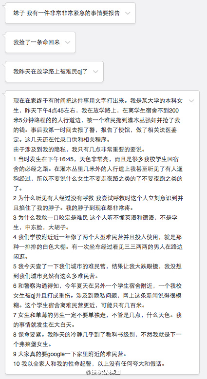 今年11月16日,一名中國女留學生在返回宿舍途中遭遇性侵并向德國警方報案。受害人曾描述說,作案嫌疑人在30到35歲之間,身高1米70,黑色頭發(fā),大胡子,外貌特征似阿拉伯裔或阿富汗裔。