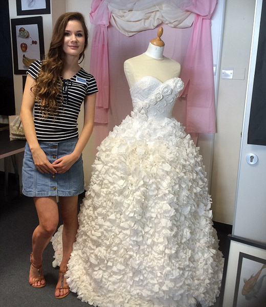 今年16歲的瑞秋·勒弗勒爾(Rachel Lefleur)為參加普通中等教育證書會(huì)考(GCSE),從2015年10月開始制作這套婚紗。該婚紗領(lǐng)口呈心形,背部設(shè)計(jì)為緊身系帶胸衣,裙擺為傘裙,并用一卷白色衛(wèi)生紙釘、粘、貼上閃閃發(fā)光的玫瑰做修飾。整套婚紗精工細(xì)作,耗時(shí)4個(gè)月完工;而成本僅30英鎊,其原材料——19卷衛(wèi)生紙僅僅花了10英鎊(約合人民幣83.3元)。