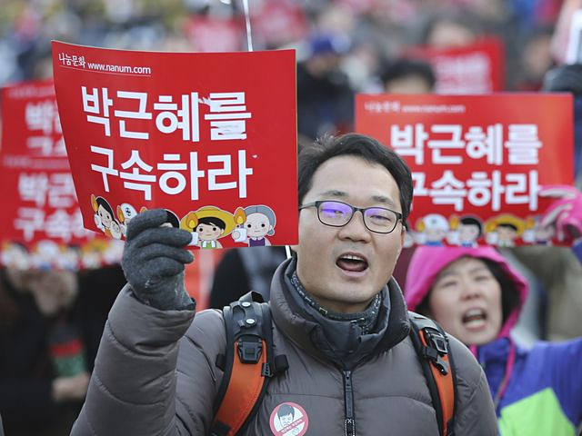12月10日,抗議者舉著要求逮捕樸槿惠的標(biāo)語(yǔ)牌,向首爾市中心青瓦臺(tái)總統(tǒng)府方向走去。(新華/美聯(lián))