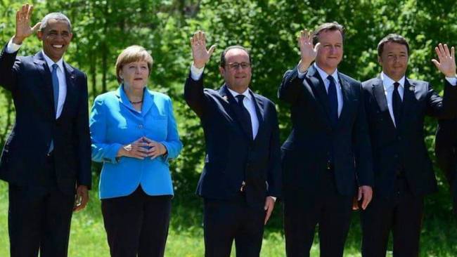 照片上從左到右依次是:美國總統(tǒng)奧巴馬、德國總理默克爾、法國總統(tǒng)奧朗德、時任英國首相卡梅倫和意大利總理倫齊。