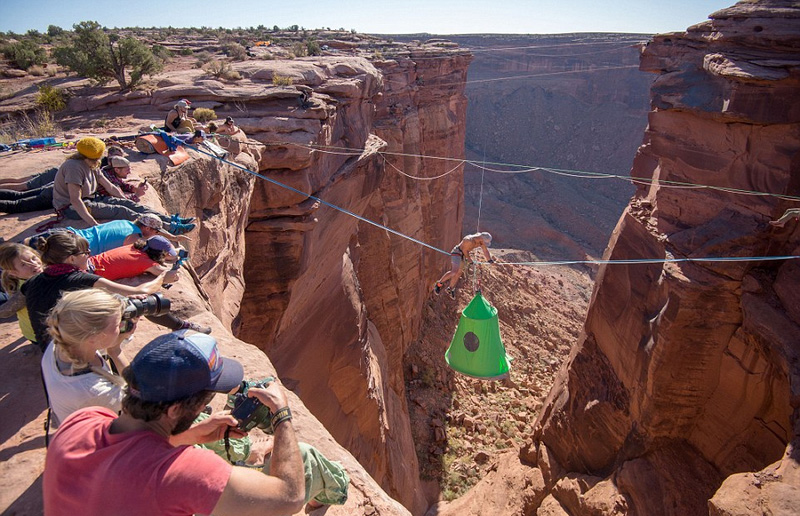 據(jù)英國《每日郵報》12月8日報道,近日,一群冒險愛好者在美國尤他州的莫泊峽谷體驗了一次高空露營,在高100多米的懸崖之間搭建了一頂懸空的帳篷。攝影師布瑞恩 莫斯博(Brian Mosbaugh)用相機記錄下這驚險的一幕。