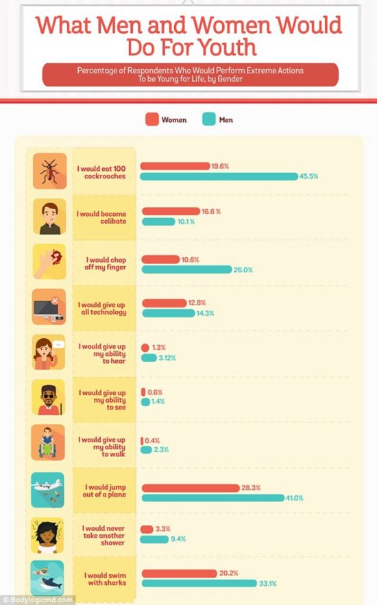 此項研究的受試者共2000人,最引人注意的是他們對獲得“年輕”的回答。千禧一代,不論年紀(jì)多大,他們更想要一輩子年輕。研究人員詢問受試者,要是能一輩子年輕,會采取哪些極端措施?34.7%的人說他們會從飛機(jī)上跳下來(研究人員并沒有提示有無降落傘),32.5%的人愿意吃100吃蟑螂,31.2%的人愿意失去味覺,26.7%的人愿意和鯊魚一起游泳,18.4%的人愿意切下手指,13.5%的人愿意遠(yuǎn)離科技,13.4%的人愿意為此單身,只有少部分人(6.3%)說不再洗澡,2.2%的人愿意喪失聽力,1.6%的人愿意喪失走路的能力,1%的人愿意喪失視力。