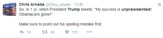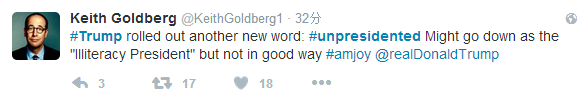 網(wǎng)友Keith Goldberg:特朗普又整出了一個新詞兒——很不總統(tǒng)(unpresidented)。這可能讓這個“文盲總統(tǒng)”留名史冊,但真不是個好辦法。